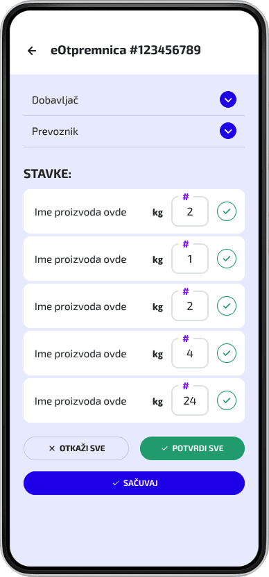 Ukoliko ste detaljno pregledali svoju eOtpremnicu, proverili da li su količine ispravne, i ako je bilo potrebno upisali razlike pored artikla, možete čekirati proizvode na zeleno dugme ✔ ili možete pritisnuti dugme POTVRDI SVE, nakon toga kliknite dugme Sačuvaj.